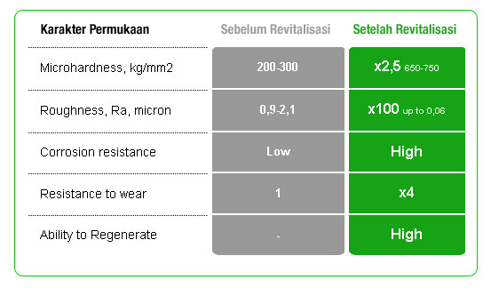 XADO Revitalizant smart nano-technology memberikan solusi pemulihan total pada permukaan logam yang saling bergesekan dalam ruang mesin yang terancam keausan akibat beban kerja. XADO Revitalizant membentuk lapisan ceramic-metal yang memulihkan permukaan logam yang saling bergesekan dalam mesin hingga mencapai hampir sama dengan ukuran semula, melapisi dengan lapisan yang sangat keras dan lebih licin, memberikan perbaikan pada tekanan kompresi dan performa keseluruhan kendaraan.